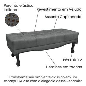 O Puff Recamier Vicenza de 160cm é uma peça de mobiliário elegante e funcional, projetada para adicionar um toque de sofisticação e conforto ao seu ambiente. Sua estrutura é construída com madeira de eucalipto reflorestada mdf, garantindo durabilidade e sustentabilidade ambiental. Os pés são feitos de madeira maciça no estilo Luís XV, proporcionando estabilidade e robustez à peça. A densidade da espuma, classificada como D26, assegura um suporte confortável para o usuário, ideal para momentos de relaxamento e descanso. O tecido em Veludo confere um acabamento suave e luxuoso, adicionando um toque de requinte ao design. Contém detalhes refinados como as tachinhas em metal fumê na borda, no assento contém detalhes em capitonê onde o estofamento é marcado com fios grossos, costurados ao tecido, formando saliências geométricas, enquanto a presença de percinta elástica italiana assegura suporte adicional e durabilidade. Com uma capacidade de suportar até 120 kg, o Puff Recamier oferece conforto e segurança para diferentes usuários. Quanto ao uso, o Puff Recamier pode ser utilizado em diversos ambientes, desde o quarto como um elegante banco no pé da cama, até a sala de estar como um sofá auxiliar ou até mesmo em espaços comerciais, como recepções ou salas de espera, adicionando conforto e estilo onde quer que esteja. Seja como um elemento decorativo ou como um lugar para relaxar, este móvel é uma escolha versátil e elegante para qualquer ambiente.