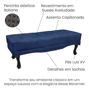 O Puff Recamier Vicenza de 90cm é uma peça de mobiliário elegante e funcional, projetada para adicionar um toque de sofisticação e conforto ao seu ambiente. Sua estrutura é construída com madeira de eucalipto reflorestada mdf, garantindo durabilidade e sustentabilidade ambiental. Os pés são feitos de madeira maciça no estilo Luís XV, proporcionando estabilidade e robustez à peça. A densidade da espuma, classificada como D26, assegura um suporte confortável para o usuário, ideal para momentos de relaxamento e descanso. O tecido em Suede confere um acabamento suave e luxuoso, adicionando um toque de requinte ao design. Contém detalhes refinados como as tachinhas em metal fumê na borda, no assento contém detalhes em capitonê onde o estofamento é marcado com fios grossos, costurados ao tecido, formando saliências geométricas, enquanto a presença de percinta elástica italiana assegura suporte adicional e durabilidade. Com uma capacidade de suportar até 120 kg, o Puff Recamier oferece conforto e segurança para diferentes usuários. Quanto ao uso, o Puff Recamier pode ser utilizado em diversos ambientes, desde o quarto como um elegante banco no pé da cama, até a sala de estar como um sofá auxiliar ou até mesmo em espaços comerciais, como recepções ou salas de espera, adicionando conforto e estilo onde quer que esteja. Seja como um elemento decorativo ou como um lugar para relaxar, este móvel é uma escolha versátil e elegante para qualquer ambiente.