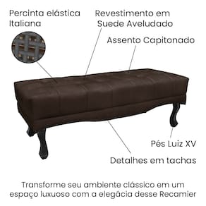 O Puff Recamier Retrô Vic foi desenvolvido para quem busca funcionalidade e elegância. Com 90cm de largura, ele é perfeito para complementar a decoração do quarto, sala ou hall de entrada, garantindo um toque de charme ao ambiente. Confeccionado em suede aveludado, proporciona um toque macio e aconchegante. O assento capitonado é preenchido com espuma D26, garantindo firmeza e durabilidade sem abrir mão do conforto. Os pés de madeira maciça estilo Luís XV oferecem um toque vintage e robustez ao móvel. Com detalhes impecáveis, como as tachinhas em metal fumê e a costura em matelassê, que reforçam a sofisticação do design e agregam personalidade e requinte à peça. Este móvel chegará em sua casa separado em 01 volume.