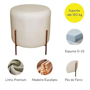 Estrutura: Madeira Eucalipto. Tecido: Linho. Material dos pés: Ferro.O puff decorativo é a escolha ideal pra você que busca mais conforto e elegância para o seu ambiente! Esse puff redondo possui um design único e versátil para compor diferentes espaços da sua casa, como sua sala de estar, quarto, escritório e recepção ou até para quando receber visitas e quiser um lugar extra para acomodar os amigos, é aquele item que consegue fazer toda a diferença nos momentos de descontração e receptividade.
