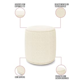 Quantos puffs você tem em casa? Nenhum? Então está na hora de mudar isso! Nada como chegar em casa, relaxar e ter um cantinho especial para esticar os pés, não é mesmo? Com o Puff Malu, não tem segredo, seus momentos de descanso serão garantidos. Além da sua simetria artística e curvas suaves, ele contém um revestimento em Bouclê que harmoniza com qualquer ambiente. Pode ser utilizado em sala de estar, recepções, escritórios, lojas, espaços comerciais, ou qualquer outro espaço que você queira decorar com estilo e bom gosto. Ele tem uma estrutura em madeira de reflorestamento eucalipto, que garante a resistência e a sustentabilidade do produto. Ele suporta até 120 kg de peso, podendo ser utilizada por pessoas de diferentes biotipos. Ele tem um acabamento reforçado e espuma de qualidade D23, que oferece maciez e aconchego. As sapatas plásticas (fixa) são pequenas proteções colocadas na base dos pés para evitar que eles risquem ou danifiquem o chão. O Puff Malu é um móvel de alta qualidade, que exala sofisticação e conforto. Ele é fácil de transportar, pois tem um peso leve e um tamanho compacto. Ele vai trazer charme, conforto incomparável e durabilidade para o seu ambiente. Corra e garanta seu Puff agora mesmo!