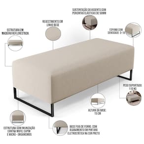 Pensando na praticidade do dia-dia, o Puff Decorativo Sala de Estar Bali W01 Base Ferro 120x50 cm Linho Bege - Lyam Decor se faz perfeito para a sua ambientação! É extremamente confortável, ideal para quem procura por funcionalidade e beleza embutidos num único produto. Estruturado com espuma macia e de alta densidade e revestimento de excelente qualidade, além de seus belos pés de metal que arrematam muito bem toda a composição deixando-o ainda mais elegante.