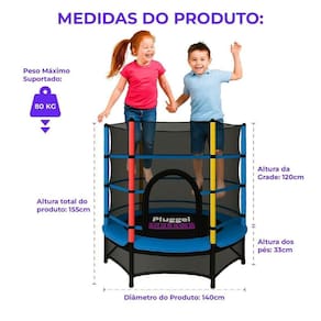 Essa Cama Elástica possui uma altura de 155cm, suporta até 80kg e é recomendada para indivíduos de 3 anos ou mais, proporcionando uma diversão contínua em que os pais podem participar com os filhos. Ela também é ideal para ser utilizada em locações, residências, escolas, brinquedotecas, buffets, hotéis, clubes, centros esportivos, entre outros.