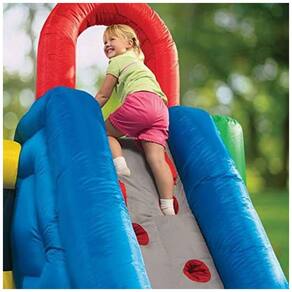 Características Um lado tem uma grande parede de escalada que leva a um escorregador de 1,2 metros de altura no bouncer O outro lado tem um escorregador menor para facilitar a saída Porta de malha Após a inflação, o soprador deve funcionar continuamente enquanto as crianças brincam Paredes feitas de proteção, durável, rede de malha Número máximo de filhos 3 Limite máximo de peso combinado 113 kg A segurança deve ser fixada firmemente no lugar
