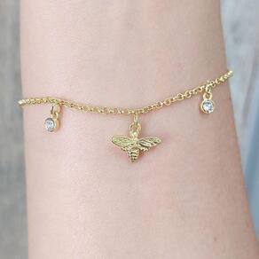 A VL traz à você uma linha de joias encantadoras, inspiradas nas abelhas. Esta pulseira foi elaborada em corrente de elos portugueses com uma pequena abelha tridimensional e 2 pontos de luz que garantem o charme e beleza dessa peça. Delicada e leve, pode ser usada no dia-a-dia e até acompanhada de outras pulseiras. Possui 3 regulagens de tamanho, sendo a menor 18cm.