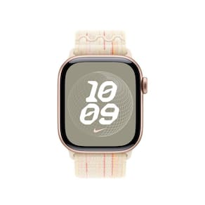 A pulseira loop esportiva é leve e respirável, redesenhada para usar fio excedente de coleções anteriores, com um padrão arrojado.