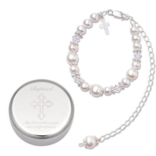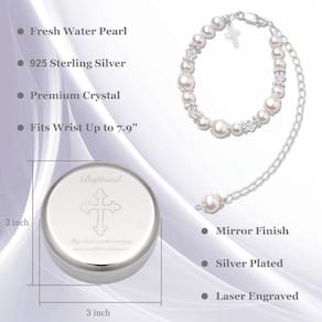 Pulseira de cruz de batismo em prata esterlina e pérolas cultivadas para bebês, com caixa de joias banhada a prata, ótimos presentes de batismo e batismo católicos para meninas - Mais do que uma pulseira de batismo – Uma lembrança única para ela em cada momento especial. Ela pode usá-la para sua cerimônia batismal e primeiro dia de comunhão. Também pode ser usada novamente como "algo antigo" quando ela se tornar uma noiva. - Her Future Heirloom - A caixa de lembrança de prata armazenará a pulseira de pérolas com segurança por décadas para que sua memória estimada possa ser transmitida de geração em geração. Um presente essencial para neta, afilhada e sobrinha de padrinhos, avós e tia. - Presente de batismo inesquecível: esta pulseira de prata esterlina com pérolas cultivadas tem um extensor que cabe em pulsos de até 20 cm. Ela também vem com uma caixa de joias clássica banhada a prata gravada em cruz como lembrança do dia do batismo. - Pronto para presentear – Este presente de batizado católico exclusivo para bebês inclui uma caixa de presente elegante e um cartão de poema na embalagem, sem necessidade de embrulho para presente. - Segurança sem preocupações - Todas as nossas joias para bebês e crianças atendem aos padrões de segurança para produtos infantis. Os componentes são livres de cádmio, BPA, PVS, ftalato e grafite.