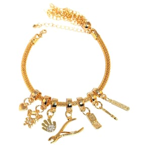 Pulseira mede aproximadamente 18 Cm, contempla todos os berloques. Quando comprar peças folheadas, duas coisas devem ser levadas em consideração, a primeira que quanto mais cuidado você ter, mais elas irão durar e que um dia infelizmente elas irão perder o brilho e a cor, afinal não são de ouro maciço. Cuidados: Não pode molhar, praticar exercícios físicos ou trabalhos forçados, suor excessivo, utilizar para dormir. Quando for utilizar qualquer tipo de cosméticos, cremes, perfume, coloque a peça folheada somente após 30 minutos. Aconselhamos a utilizar seu folheado mais para sair. Assim você irá diminuir os riscos que as citações acima ocorram. Quanto mais cuidar, mais ira durar. Nossa é de 3 meses quanto a defeitos de fábrica. Ean: 7909389376771