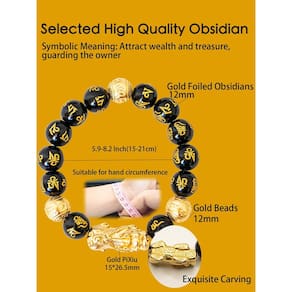 CARACTERÍSTICAS: Cada cordão da pulseira Feng Shui Black Obsidian mede aproximadamente 0,47 polegadas/12 mm de diâmetro, adequada para homens e mulheres. A pulseira de miçangas é feita de um cordão elástico ajustável. A pulseira de obsidiana pode ser ajustada de forma fácil e flexível de acordo com o tamanho do seu pulso. ESPECIFICAÇÕES: Quantidade: 1 peça Cor: preto Tamanho do talão: 12 mm; Tamanho PiXiu : cerca de 1,05* 0,47 polegadas (26,5* 12 mm) Pulseira adequada para circunferência da mão: 5,9 a 8,2 polegadas (15 ~ 21 cm) Material: obsidiana natural O PACOTE INCLUI: 1 pulseira Feng Shui Obsidian Pixiu; 1 caixa de embalagem requintada; 1 bolsa Fortune; 1 x certificado - Feng Shui Pulseira G Shui: Pixiu é uma fera sortuda na cultura asiática, significa atrair riqueza e afastar pessoas más. A pulseira de obsidiana evita ataques psíquicos e elimina a energia negativa. A pulseira Pixiu vem com um certificado de consagração, significa boa sorte, riqueza, saúde e paz. - Pulseira de alta qualidade: esta pulseira de riqueza de obsidiana feng shui é feita de Pixiu banhado a ouro 24K, 3 contas banhadas a ouro e 12 obsidianas de mantra douradas de seis sílabas. A pulseira Lucky se encaixa na circunferência do pulso: 5,9 ~ 8,2 polegadas, adequada para a maioria dos homens e mulheres. A obsidiana é uma pedra preciosa natural formada pelo rápido resfriamento de minerais expelidos de vulcões de alta temperatura. A obsidiana preta pura é mais rara e pode aliviar o desconforto mental. - Artesanato: a pulseira pixiu de obsidiana é cuidadosamente feita à mão por mestres artesãos. As contas douradas e o duende dourado da pulseira dragão usam processo de lixamento em ouro 24K e revestimento a vácuo de alta pressão a alta temperatura, nunca desbotam. Runas requintadas esculpidas, combinadas com obsidiana mantra dourada de seis sílabas, a pulseira combina artesanato enxuto e excelente qualidade. - Corda de cristal durável: pulseira Feng shui pixiu wealth adequada para a circunferência do pulso de 5,9 a 8,2 polegadas (15 a 21 cm). Miçangas de mantra de seis sílabas (diâmetro: 0,47 polegadas (12 mm), material: obsidiana dourada); PiXiu (tamanho: 1,05* 0,47 polegadas (26,5* 12 mm), material: pixiu banhado a ouro 24K); contas douradas (diâmetro: 0,47 polegadas (12 mm), material: contas banhadas a ouro 24K). A pulseira budista de contas de oração é conectada por uma corda elástica de cristal durável para garantir que a pulseira seja durável. - Presente perfeito: a pulseira de proteção é abençoada pelos monges do templo, e cada pulseira de bênção vem com um certificado de consagração e uma linda caixa de presente. Você pode escolher esta pulseira de boa sorte como presente de Natal, Ação de Graças, Dia das Mães, Dia dos Pais, aniversário, cerimônia de formatura, etc. Dê para sua família ou amigos e traga-lhes bênçãos e boa sorte. - Melhor serviço: esta pulseira de dragão de alta qualidade é um dos presentes mais significativos. Oferecemos um reembolso total ou garantia de troca. Se você tiver alguma dúvida, sinta-se à vontade para entrar em contato conosco, responderemos dentro de 12 horas e faremos o possível para deixá-lo satisfeito. - Pulseira de consagração: a obsidiana de seis caracteres estampada em papel alumínio é uma oração sincera no budismo e no tantra tibetanos. A pulseira de mantras de seis sílabas trará as bênçãos do budismo. A obsidiana negra é um dos sete tesouros do budismo e, por causa de sua obsidiana com PiXiu, pode ser usada como talismã.