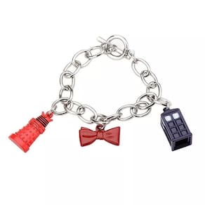 Pulseira Doctor Who com Dalek, gravata borboleta e TARDIS Charm Pulseira temática de Doctor Who licenciada pela BBC Se você mora na Terra ou em Gallifrey, você se destacará com esta pulseira de charme inspirada em Doctor Who licenciada pela BBC. Completa com Dalek, TARDIS e gravata borboleta, esta pulseira Doctor Who exala 'nerd' e será o presente retrô perfeito para qualquer Whovian dentro ou fora do planeta.