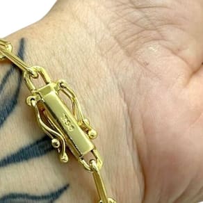 Pulseira Cadeado 6mm Alongado Fecho 750 Banhado a Ouro Detalhes do Produto: Material: ligas metálicas de alta qualidade, especialmente tratadas para fixação e absorção do ouro, com acabamento em verniz protetor. Aparência: visual idêntico ao ouro maciço. Produção: artesanal, com atenção meticulosa aos detalhes. Banho: 10 camadas espessas de ouro 18k, finalizadas com verniz antialérgico . Elos: soldados varia conforme o modelo . Pedras: zircônias brilhantes cravejadas quando aplicável . Tamanhos Disponíveis: Cordões Masculinos: 70cm padrão e 60cm sob consulta/Pedido Via Chat . Cordões Femininos: 50cm padrão e 45cm sob consulta/Pedido Via Chat . Pulseiras: 21cm padrão ; tamanhos de 18cm a 23cm sob consulta/Pedido Via Chat. Pingentes: conforme imagens; consulte para mais detalhes via chat. Espessuras Recomendadas para Cordões / Pingentes: P: 1mm a 4mm M: 4mm a 8mm G: 6mm a 13mm Gg: 12mm a 18mm Incluso na Compra: Saquinho de organza para armazenamento seguro. Caixa elegante, perfeita para presente. Cupom de desconto para a próxima compra. Flyer com outros produtos da coleção. Carta de agradecimento personalizada. Adesivo da marca ToJoia18k. Informações Adicionais: : 6 meses termos acompanham o produto . Devolução: 7 dias para devolução sem questionamentos. Envio: despacho em até 24 horas úteis após confirmação do pagamento. Cuidados com a Peça: Evite contato com produtos químicos; aguarde o perfume secar antes de usar. Evite contato com shampoo, condicionadores e suor excessivo. Armazene em local seco, preferencialmente no saquinho de organza fornecido. Uso no mar e piscina é permitido; lave com água corrente e sabão neutro após. Por que Escolher a ToJoia18k Semi-joias luxuosas que combinam estilo, qualidade e sofisticação. Banho espesso de ouro 18k, garantindo brilho duradouro e acabamento impecável. Design exclusivo e produção artesanal, perfeitos para qualquer ocasião. Materiais premium que asseguram durabilidade. Ao escolher uma semi-joia ToJoia18k, você investe em qualidade, elegância e uma experiência única. Aguardamos sua compra Observação: pode ocorrer variação no fecho raramente . Imagens reais, sem edição. Qualquer dúvida, estamos à disposição para esclarecimentos.