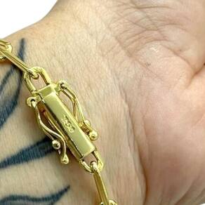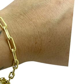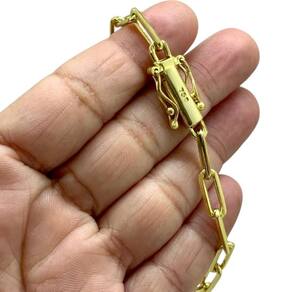 Pulseira Cadeado 6mm Alongado Fecho 750 Banhado a Ouro Detalhes do Produto: Material: ligas metálicas de alta qualidade, especialmente tratadas para fixação e absorção do ouro, com acabamento em verniz protetor. Aparência: visual idêntico ao ouro maciço. Produção: artesanal, com atenção meticulosa aos detalhes. Banho: 10 camadas espessas de ouro 18k, finalizadas com verniz antialérgico . Elos: soldados varia conforme o modelo . Pedras: zircônias brilhantes cravejadas quando aplicável . Tamanhos Disponíveis: Cordões Masculinos: 70cm padrão e 60cm sob consulta/Pedido Via Chat . Cordões Femininos: 50cm padrão e 45cm sob consulta/Pedido Via Chat . Pulseiras: 21cm padrão ; tamanhos de 18cm a 23cm sob consulta/Pedido Via Chat. Pingentes: conforme imagens; consulte para mais detalhes via chat. Espessuras Recomendadas para Cordões / Pingentes: P: 1mm a 4mm M: 4mm a 8mm G: 6mm a 13mm Gg: 12mm a 18mm Incluso na Compra: Saquinho de organza para armazenamento seguro. Caixa elegante, perfeita para presente. Cupom de desconto para a próxima compra. Flyer com outros produtos da coleção. Carta de agradecimento personalizada. Adesivo da marca ToJoia18k. Informações Adicionais: : 6 meses termos acompanham o produto . Devolução: 7 dias para devolução sem questionamentos. Envio: despacho em até 24 horas úteis após confirmação do pagamento. Cuidados com a Peça: Evite contato com produtos químicos; aguarde o perfume secar antes de usar. Evite contato com shampoo, condicionadores e suor excessivo. Armazene em local seco, preferencialmente no saquinho de organza fornecido. Uso no mar e piscina é permitido; lave com água corrente e sabão neutro após. Por que Escolher a ToJoia18k Semi-joias luxuosas que combinam estilo, qualidade e sofisticação. Banho espesso de ouro 18k, garantindo brilho duradouro e acabamento impecável. Design exclusivo e produção artesanal, perfeitos para qualquer ocasião. Materiais premium que asseguram durabilidade. Ao escolher uma semi-joia ToJoia18k, você investe em qualidade, elegância e uma experiência única. Aguardamos sua compra Observação: pode ocorrer variação no fecho raramente . Imagens reais, sem edição. Qualquer dúvida, estamos à disposição para esclarecimentos. Marca: Não Informado