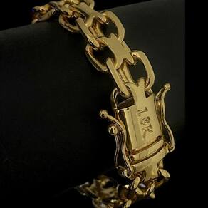 - Material: Ligas metálicas de alta qualidade, desenvolvidas para fixação e absorção do ouro, finalizadas com verniz protetor. - Tonalidade: Aparência idêntica ao ouro maciço. - Produção: Artesanal, com atenção aos detalhes. - Tipo de banho: Banhadas a ouro 18k com 10 camadas espessas, finalizadas com verniz antialérgico importado. - Elos: Soldados dependendo do modelo . - Pedras cravejadas: Zircônia brilhante quando aplicável .