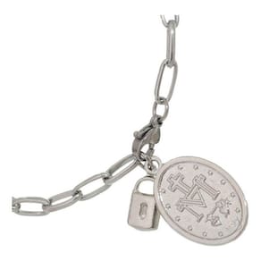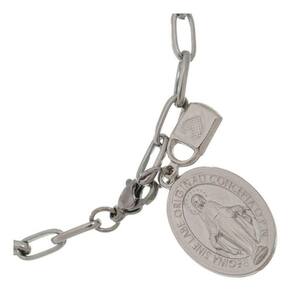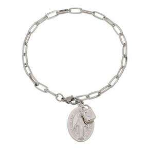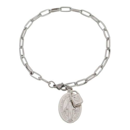 Pulseira de consagração com medalha de Nossa Senhora das Graças e pingente em formato de cadeado. Peça em aço inox.