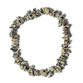 Pulseira de Jaspe Dálmata Natural – Cascalho Rolado em Fio de Silicone Realce sua energia e estilo com a Pulseira de Cascalho de Jaspe Dálmata Natural. Com sua aparência única, marcada por tons de bege com pontuações negras, essa joia artesanal se destaca pela autenticidade, proteção e conexão com a natureza. Produzida com pedras verdadeiras de garimpo e montada em fio de silicone elástico, oferece conforto, versatilidade e um encaixe perfeito em diferentes tamanhos de pulso. Um acessório leve, cheio de significado e personalidade — ideal para uso diário, espiritualidade ou para complementar composições mais modernas e naturais. Detalhes do Produto: