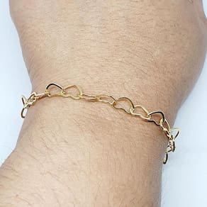 Pulseira Chloe exclusivo da Coleção Amore Mio semi jóias de luxo folheada a ouro 18k ,pulseira com elos de coração com 5 fios. Super tendência para deixar você super elegante com as semi jóias Maria Rita Designer. Ficha técnica; Tipo de banho: Folheado a ouro 18K Cor do banho:Dourado Peso:4,5 gs Tamanho:19cm comprimento e 5,0cm de alongador . Você receberá suas semi jóias embalada em caixa acompanhada do certificado de garantia. Cuidados e conservação com a semi jòia: Para o seu conforto utilizamos materiais que reduzem o risco de alergia e camadas de banho de qualidade que aumentam a durabilidade ,por isso a garantia de 2 anos. Para manter o brilho e a cor da sua semi jòia, são necessários alguns cuidados simples, como evitar o contato com produtos químicos, como itens de limpeza, cloro de piscina, entre outros; procurar não tomar banho com a semi jòia para evitar a opacidade do metal; e limpar a peça com uma flanela macia, guardando-as sempre individualmente. A Maria Rita Designer acredita que toda mulher é única e especial. Nosso objetivo é contribuir com o destaque de sua beleza através das criações das semi jóias de altíssima qualidade, com modelos clássicos, modernos e contemporâneos, ideal para qualquer momento do seu dia. Para o seu conforto utilizamos materiais que reduzem o risco de alergia e camadas de banho de qualidade que aumentam a durabilidade ,por isso a garantia de 2 anos. A gente faz parte do seu look USEMARIARITA Marca: Maria Rita Designer