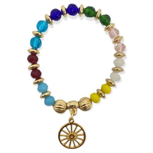 Pulseira cigana colorida com pingente roda em cristal e silicone douradas Esta linda pulseira de fabricação da lua mística é confeccionada artesanalmente com cristais, pedras e elástico de silicone, o que lhe confere durabilidade, resistência, conforto e beleza.É adequada para usar em qualquer ocasião, com design elegante.Excelente para presentear, cheio de amor, carregando promessa e confiança, expressando bênçãos, proteção, sorte e apreciação.É um excelente presente para aniversários, graduações ou apenas ofertar a sorte àqueles que ama.Mude hoje mesmo o seu destinoCaracterísticas técnicas: Pulseira unisex Pedras e cristais: 8 mm Gênero: masculino/feminino Peso: 30 gramascuidados com seu acessório: Evite atrito entre as peças para não comprometer o visual. Cremes corporais, perfumes e óleos podem danificar seus acessórios. Utilize flanela macia e seca para limpeza de sua pulseira. Com esses cuidados sua peça terá uma maior vida útil.Gratidão e sucesso Marca: Não Informado