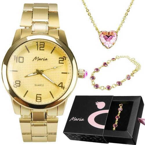 Pulseira + colar coração + relogio feminino dourado strass Kit Relógio Feminino Dourado Orizom com Pulseira e Colar Banhado a Ouro