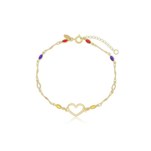 Pulseira Colorida com Coração Banhada a Ouro 18k 8269 Pulseira: em resina colorida medindo 18cm + 3cm de extensor regulável com coração vazado medindo 1,5cm aproximandamente.