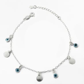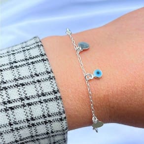Uma elegante pulseira feminina de Prata 925 com pingentes de Olho Grego pendurados. Esta joia combina beleza e proteção, sendo perfeita para ocasiões especiais ou uso diário. É um presente significativo e um amuleto de boa sorte. Adquira a sua pulseira única hoje e desfrute da beleza e proteção do Olho Grego em grande estilo!