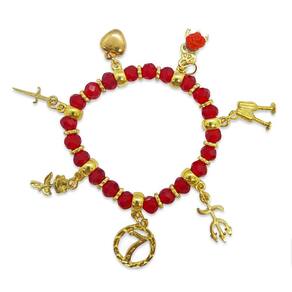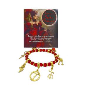 Linda pulseira feminina com pedras vermelhas e pretas e tridentes dourados.