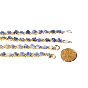 Pulseira Corrente com Pedra Sodalita Azul Rolada Colada Em cima ótimo Brilho, pedra genuina, mineral autentico. Pulseira com arco em forma de Elo de Corrente com Pedra Colada no Topo Metal Dourado. Observação: Pedras Colada na corrente, Produto simples e de baixo Custo; pode soltar com o tempo só compre após ler e entender isso.