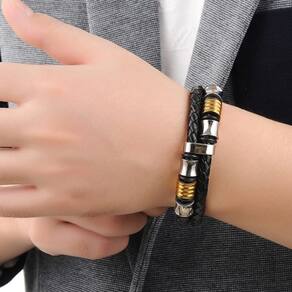 Características Pulseira couro trançado e aço dourado Material: A pulseira é fabricada em couro sintético, aço inoxidável. Cor: disponível na cor preta, com detalhes em dourado.
