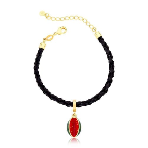 Como símbolo das frutas do Agro brasileiro, a Melancia Pingo Doce veio representada nesse belo Charm com detalhes realistas esmaltados e Revestimento Ouro. Acompanhado de uma pulseira em couro natural trançado preto, esse acessório se torna prático e versátil para o dia a dia.
