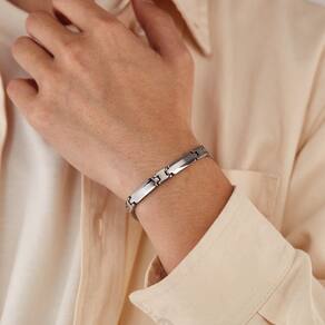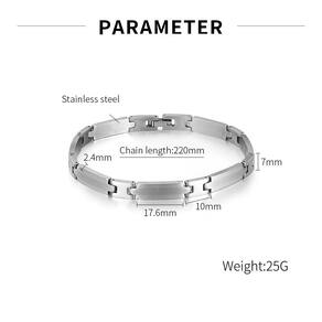 Tamanho: 22 x 0,7 x 0,24 cm Peso: 25 g Material: aço inoxidável Estética moderna minimalista — apresenta uma estrutura de elos limpa e retangular com acabamento escovado, oferecendo uma aparência elegante e contemporânea, perfeita para homens preocupados com a moda. Durabilidade do aço inoxidável — Feita de aço inoxidável de alta qualidade, esta pulseira é altamente resistente a manchas, arranhões e corrosão para uso duradouro. Leve e confortável — Com um peso de apenas 25 g e bordas lisas, oferece uma experiência de uso confortável, adequada para uso diário prolongado sem irritação. Design de fecho seguro — equipado com um fecho dobrável confiável que garante que a pulseira permaneça segura em seu pulso durante o trabalho, esportes ou lazer. Estilo versátil para todas as ocasiões — O design discreto em aço titânio o torna ideal para looks casuais, de escritório ou para sair à noite, complementando facilmente uma ampla variedade de roupas.