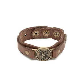 Pulseira de Couro de São Miguel, produzida com materiais de qualidade em couro marrom e metais em ouro velho.