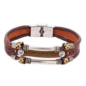 Pulseira de Couro Masculina One way Rica em detalhes que chamam atenção, e cores que se complementam perfeitamente, a Pulseira de Couro One way é uma bela combinação de charme e bom gosto. Chama atenção por sua frase: Where there's a will there's a way. Que significa Onde há vontade há um caminho. Os detalhes e os pingentes da pulseira são soltos, trazendo um design mais livre para a peça. Sendo assim, uma peça que da personalidade e força ao look.