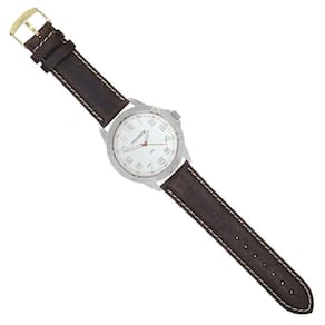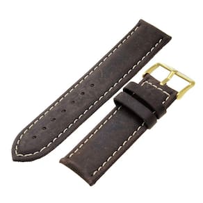 Pulseira para relógio fabricada em couro na cor Marrom, possui costuras e fivela de metal.