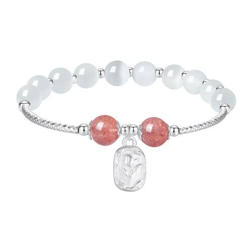 Tamanho: Diâmetro do cordão 8 mm, perímetro 17-19 cm Peso: 11 g Material: Cat's EyeTulip Charm with Meaning — Apresenta um pingente de tulipa finamente detalhado em prata fina 999, simbolizando beleza, graça e confiança silenciosa. Harmonia e contraste de cores — Combina miçangas brancas suaves de olho de gato com detalhes vívidos de quartzo de morango, oferecendo um contraste de cores fresco e elegante. Design refinado em prata 999 — Inclui componentes decorativos em prata de alta pureza que aprimoram a textura, o brilho e a sofisticação cultural da pulseira. Ajuste elástico confortável — a faixa elástica se ajusta confortavelmente aos pulsos de 17 a 19 cm, adequada para uso diário ou para uso em camadas com outros acessórios minimalistas. Nova estética de estilo chinês — inspirada na arte de pequenos lotes e no simbolismo tradicional, ideal para mulheres que apreciam joias graciosas e espirituais.