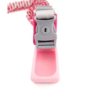 Mais segurança: ela deve ser primeiro colocada na criança e depois no adulto. O ajuste é feito de forma rápida e fácil. A pulseira menor, com uma >vela, deve ser usada pela criança e com a chave que fica na pulseira de adulto, trave a fivela.