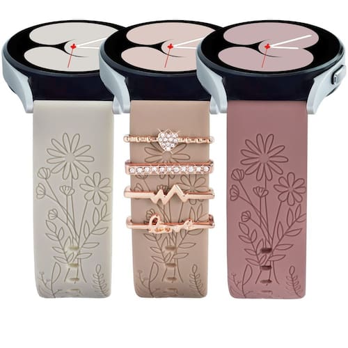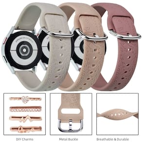 - Estampas e pingentes gravados na moda: as pulseiras ORATYFAN para Samsung Watch 5 têm duas diferenças em relação às outras pulseiras de relógio, com estampas de flores silvestres esculpidas a laser na pulseira, que são modernas e inovadoras sem desbotar. Também é combinada com 4 peças de anéis decorativos personalizados para fazer você parecer mais enérgico e se diferenciar das pulseiras de relógio usadas por outras pessoas. Seja para reuniões, bate-papos ou treinos, você parecerá mais exclusivo e receberá mais elogios.