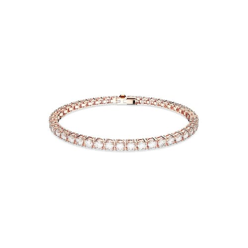 Swarovski Pulseira de tênis Matrix, Zircônia cúbica, Zircônia cúbica - Medidas: Comprimento 16 cm, Largura 1/20.3 cm - Um mundo de maravilhas o aguarda: envolva seu pulso em joias vibrantes com esta pulseira de tênis deslumbrante, com uma fileira de pedras redondas e transparentes em uma pulseira com acabamento em tom de ouro rosa, para um visual chique e elegante - Versátil e atraente: um design clássico e atemporal que combina cristais transparentes deslumbrantes que refletem lindamente a luz com metal brilhante com acabamento em tom de ouro rosa, para uma peça sedutora - Elegância sonhadora: use esta pulseira brilhante com outras peças da coleção Matrix Tennis ou apresente-a como um presente romântico para aquela pessoa especial em sua vida - Projetado para durar: as joias Swarovski mantêm seu brilho quando práticas de cuidados simples são observadas; remova antes de entrar em contato com água, loções ou perfumes e polir com um pano sem fiapos - Itens entregues: (1) Pulseira de tênis Swarovski Matrix com cristais redondos e transparentes em uma pulseira com acabamento em tom de ouro rosa, tamanho M, completa com caixa de pulseira Swarovski