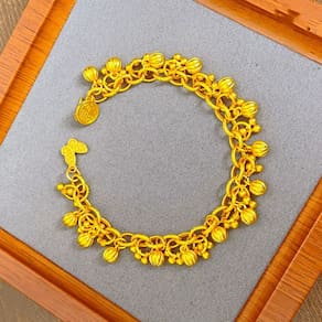 Peso: 33 g Material: Gold Placer Abundant Design inspirado em frutas — apresenta pingentes agrupados que lembram frutas maduras, simbolizando prosperidade, abundância e energia da colheita. Estilo vintage banhado a ouro — Feito com intrincados elos de corrente dourados e detalhes pendentes que refletem o artesanato tradicional com um toque luxuoso. Soft Bell Accents — Inclui pequenos pingentes em forma de sino que se movem suavemente e emitem sons sutis, adicionando apelo visual e sensorial. Fecho oriental seguro — O fecho é detalhado com motivos culturais, incluindo símbolos de borboletas e fortunas, aprimorando a identidade tradicional da pulseira. Estética exótica e espiritual — Ideal para mulheres que buscam um acessório marcante com simbolismo tradicional, adequado tanto para o estilo diário quanto para uso festivo.