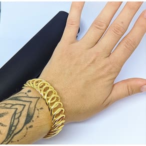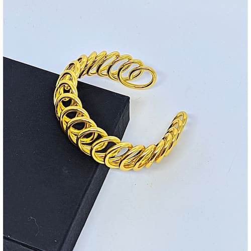 Pulseira rígido tipo Bracelete de aço em círculos dourados de design moderno, perfeito para qualquer ocasião. É feito de aço, o que o torna durável e resistente à água e ao desgaste. É hipoalergênico, o que o torna seguro para pessoas com pele sensível ou alergias.