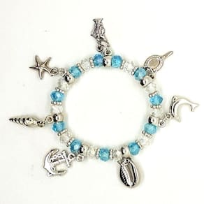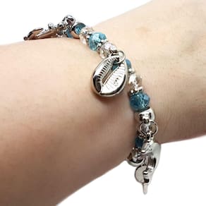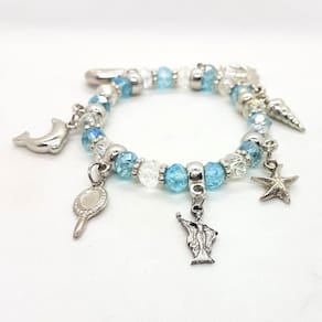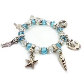 Linda pulseira feminina com pedras Brancas e Azul Claro e acessórios Prateados.