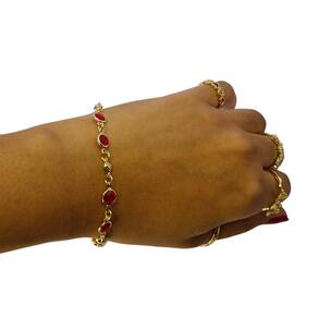 A Pulseira Folheada Ouro com Zircônias Vermelhas da Bialluz, carrega promessa e confiança, expressando bênçãos, proteção, sorte, amor e apreciação, um mimo. Excelente para presentear, aniversários, graduações ou apenas ofertar a sorte àqueles que ama, podendo ser benzida.