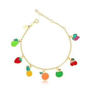Simbolizando as frutas que enriquecem nosso Agro, a VL accessoires traz à você essa linda pulseira Frutas do Agro Revestida em Ouro! Elaborada em corrente de elos portugueses, conta com as frutas: pêra, morango, abacaxi, laranja, côco, cereja e uva. Colorida e delicada, um acessório casual que permite combinar com outras pulseiras.