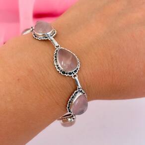 Pulseira Gotas Quartzo Rosa Prata De Bali 925 Pulseira Gotas Quartzo Rosa Prata de Bali 925 19cm - Pulseira Gotas Quartzo Rosa Prata de Bali 925 Pulseira encantadora com design artesanal em Prata de Bali 925, composta por delicadas gotas de Quartzo Rosa natural. Com 19 cm de comprimento e 1,4 cm de largura, essa joia feminina transmite suavidade e elegância em cada detalhe. As pedras lapidadas em formato de gota são envoltas por arabescos em prata, criando um contraste perfeito entre a delicadeza e a tradição da prata de Bali. Uma peça única para mulheres que valorizam o poder das pedras naturais e a beleza atemporal.