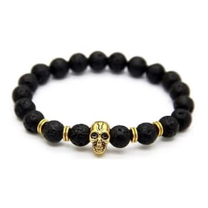 Pulseira masculina pedra lava vulcânica com caveira dourada Se você é do tipo de homem que procura elegância, design e acabamento perfeito em um acessório, a Pulseira Pedra Lava Vulcânica com Caveira Dourada traz isso e muito mais. Sua perfeita combinação entre o preto e o dourado a torna um coringa na hora de montar o look perfeito. Características Pulseira lava vulcânica com caveira Material: A pulseira é fabricada em pedras de lava vulcânica de 8mm, caveira e entremeios em aço, presos em um resistente elástico de silicone. Cor: disponível na cor preta, com detalhes em dourado. Tamanho: Tamanho: 21cm Ideal para ser Utilizado em punhos de 18cm folgada, com caimento no punho a 20cm justa, sem caimento no punho . Ean: 7599683446890