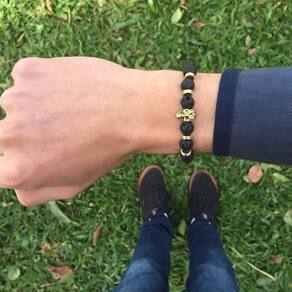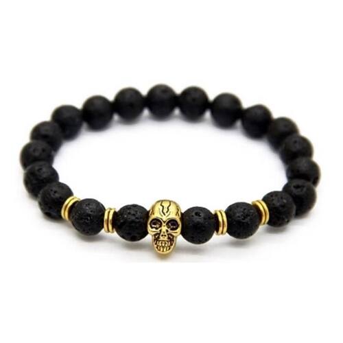 Pulseira masculina pedra lava vulcânica com caveira dourada Se você é do tipo de homem que procura elegância, design e acabamento perfeito em um acessório, a Pulseira Pedra Lava Vulcânica com Caveira Dourada traz isso e muito mais. Sua perfeita combinação entre o preto e o dourado a torna um coringa na hora de montar o look perfeito. Características Pulseira lava vulcânica com caveira Material: A pulseira é fabricada em pedras de lava vulcânica de 8mm, caveira e entremeios em aço, presos em um resistente elástico de silicone. Cor: disponível na cor preta, com detalhes em dourado. Tamanho: Tamanho: 21cm Ideal para ser Utilizado em punhos de 18cm folgada, com caimento no punho a 20cm justa, sem caimento no punho .