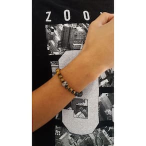 Pulseira Masculina Pedras Ônix e Olho de Tigre Espartano Prata. Especificações do produto Comprimento: 18cm - 20cm ajustável Material: contas de pedra Vulcânica e Metal Diâmetro: 6cm Tamanho do grânulo: 8mm Pingente tamanho: 2,5cm Peso: 40g 3 meses de Garantia Marca: Tulerry Semijoias Ean: 0701705813567