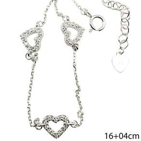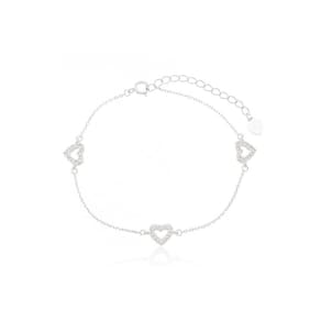 Pulseira Minimalista Três Corações Cravejados Prata 925 16cm - Pulseira Minimalista Três Corações Cravejados Prata 925