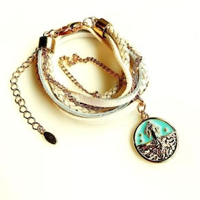 Pulseira com pingente iemanjá com resina glitter azul celeste. Um poderoso amuleto da mãe das águas. Diâmetro pingentel: 26mm Pulseira feita com 3 tiras de couro diferentes, corrente , pingente de signo com fecho mosquetão com desenho de coração, banhadas a ouro amarelo 18k e corrente extensora . Pode ser Utilizado tambem como gargantilha ou chocker Tamanho total da pulseira: 35 cm de comprimento + 5 cm de extensor Tamanho do pingente: 16,00mm de diâmetro x 2,40 de espessura. Tipo de couro: achatado e trançado, natural e sintético Metal base do fecho, entremeios e pingente: zamaque de 3 meses no banho e cravação das pedras mediante a defeitos de fabricação e não mau uso pelo cliente Caso aconteça um desgaste do banho, mudança de coloração, a peça será submetida a teste para averiguar se foi problema de fabricação ou mau uso. Nosso banho é denominado hipoalergênico pois não contém niquel na composição Marca: Não Informado