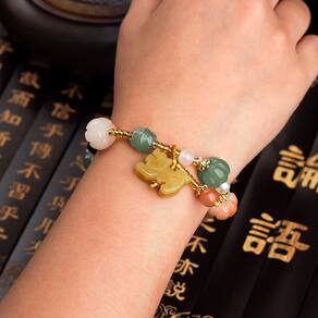 Peso: 28 g Material: pulseira de jade artesanal Jinsi Yu — Feita de jade Jinsi genuíno, complementada por contas de aventurina e jade amarelo, esta pulseira apresenta uma aparência colorida polida à mão. Design vintage chinês — combina elementos chineses tradicionais com um toque moderno, incluindo miçangas esculpidas em estilo abóbora e espaçadores dourados. Acento exclusivo de elefante — finalizado com um pingente de elefante de jade amarelo esculpido e miçangas decorativas, adicionando beleza simbólica e movimentos divertidos. Peso e sensação premium — pesa aproximadamente 28 g, proporcionando uma sensação substancial e luxuosa sem comprometer o conforto. Ideal para mulheres modernas — Adequado para quem aprecia acessórios exclusivos e de inspiração cultural, perfeitos para roupas casuais ou looks marcantes.