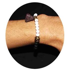 Contém Uma Pulseira Nlux Masculina com Purpurita de verdade (100% Natural), miçangas pretas e metal estiloso em contato com a Purpurita.