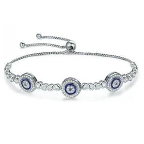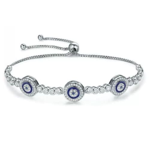 Pulseira Olho Grego: uma dose diária de proteção. Inspirada no talismã que protege contra o mal e a inveja, essa pulseira em Prata 925 com acabamento à mão apresenta uma fileira de Zircônias transparentes brilhantes que emolduram uma composição de Zircônias menores e esmalte azul que formam três olhos gregos.